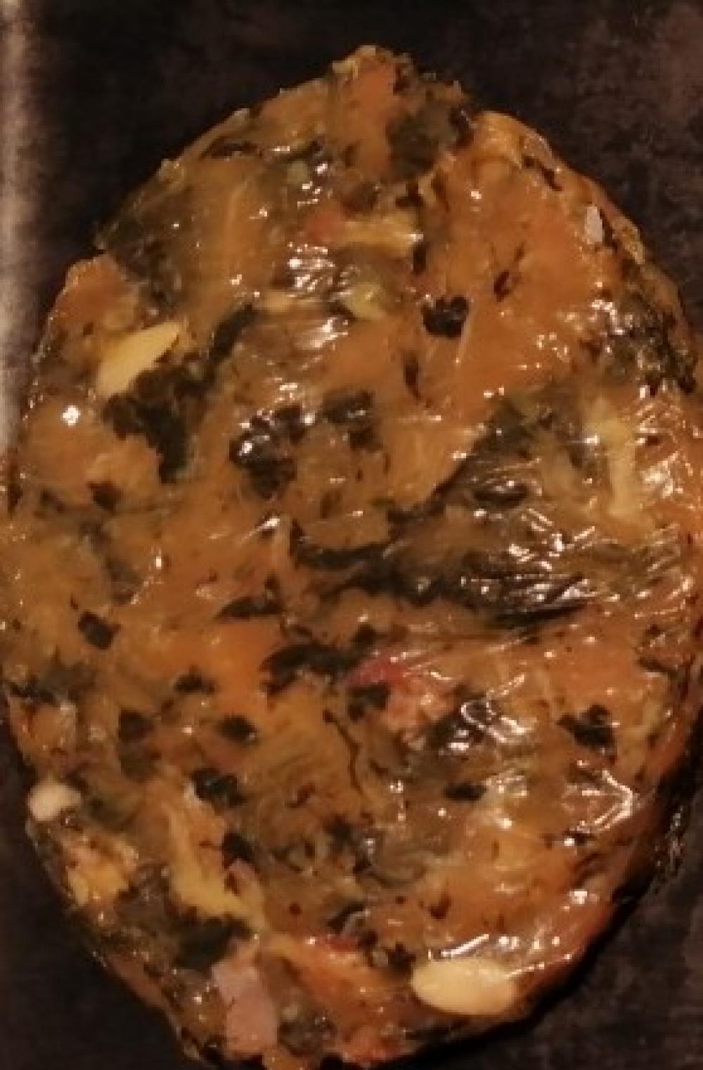 Hamburguesa de Pollastre amb Espinacs. Ingredients: pollastre, espincacs a la catalana(espinacs,bacon,panses i pinyons,oli de girasol i sal)