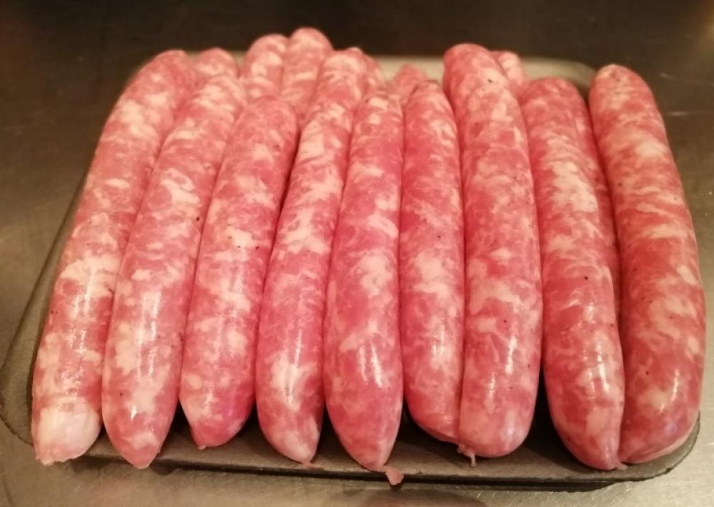 Salsitxes de porc. Ingredients: porc,pebre blanc i negre, additiu salsitxa.