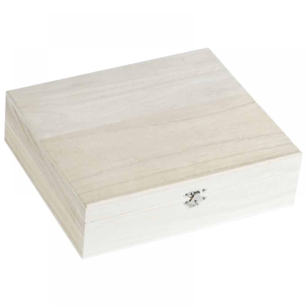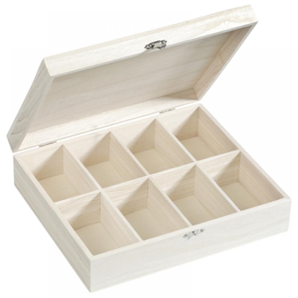 27,5 x 23,5 x 7,5 cm. Tapa abatible y cerradura. 8 compartimentos. Madera natural.