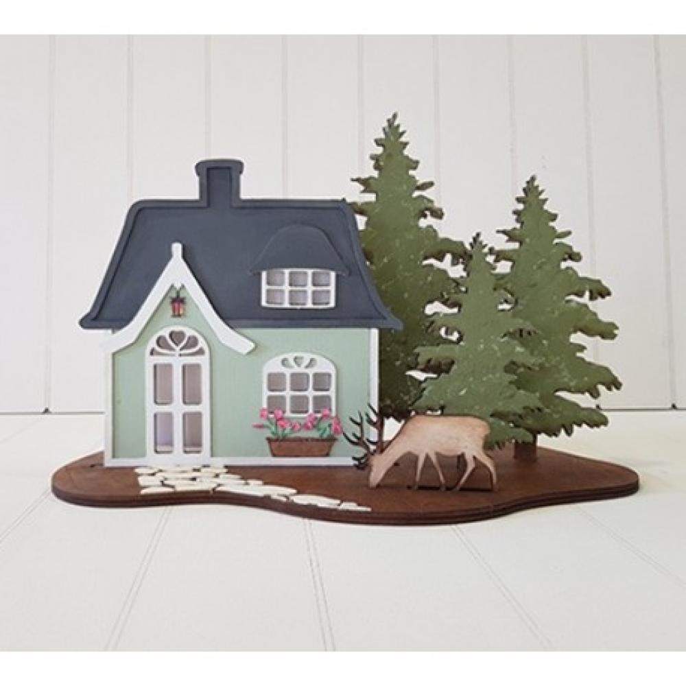 Kit compuesto de piezas de madera que forman la composición de una escena de cabaña en el bosque con ciervo.